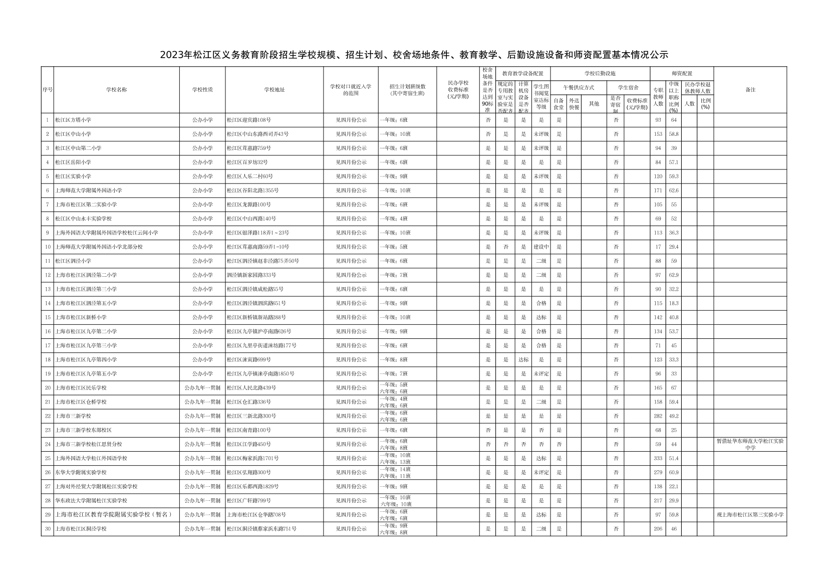 | 2023年松江区义务教育阶段招生学校规模、招生计划、校舍场地条件、教育教学、后勤设施设备和师资配置基本情况公示 | ||||||||||||||||||||