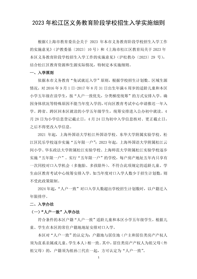 根据《上海市教育委员会关于 2023 年本市义务教育阶段学校招生入学工作的实施意见》(沪教委基〔2023〕10号)和《上海市松江区教育局关于2023年本区义务教育阶段学校招生入学工作的实施意见》(沪松教办〔2023〕29 号),结合松江区教育资源和生源实际情况,特制定本实施细则。