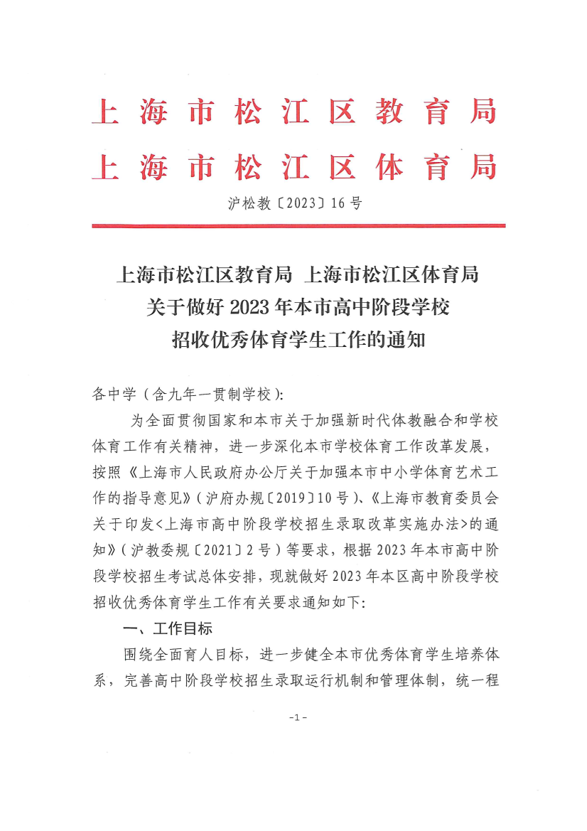 为全面贯彻国家和本市关于加强新时代体教融合和学校体育工作有关精神,进一步深化本市学校体育工作改革发展,按照《上海市人民政府办公厅关于加强本市中小学体育艺术工作的指导意见》(沪府办规〔2019〕10号)、《上海市教育委员会关于印发<上海市高中阶段学校招生录取改革实施办法>的通知》(沪教委规〔2021〕2号)等要求,根据2023年本市高中阶段学校招生考试总体安排,现就做好2023年本区高中阶段学校招收优秀体育学生工作有关要求通知如下: