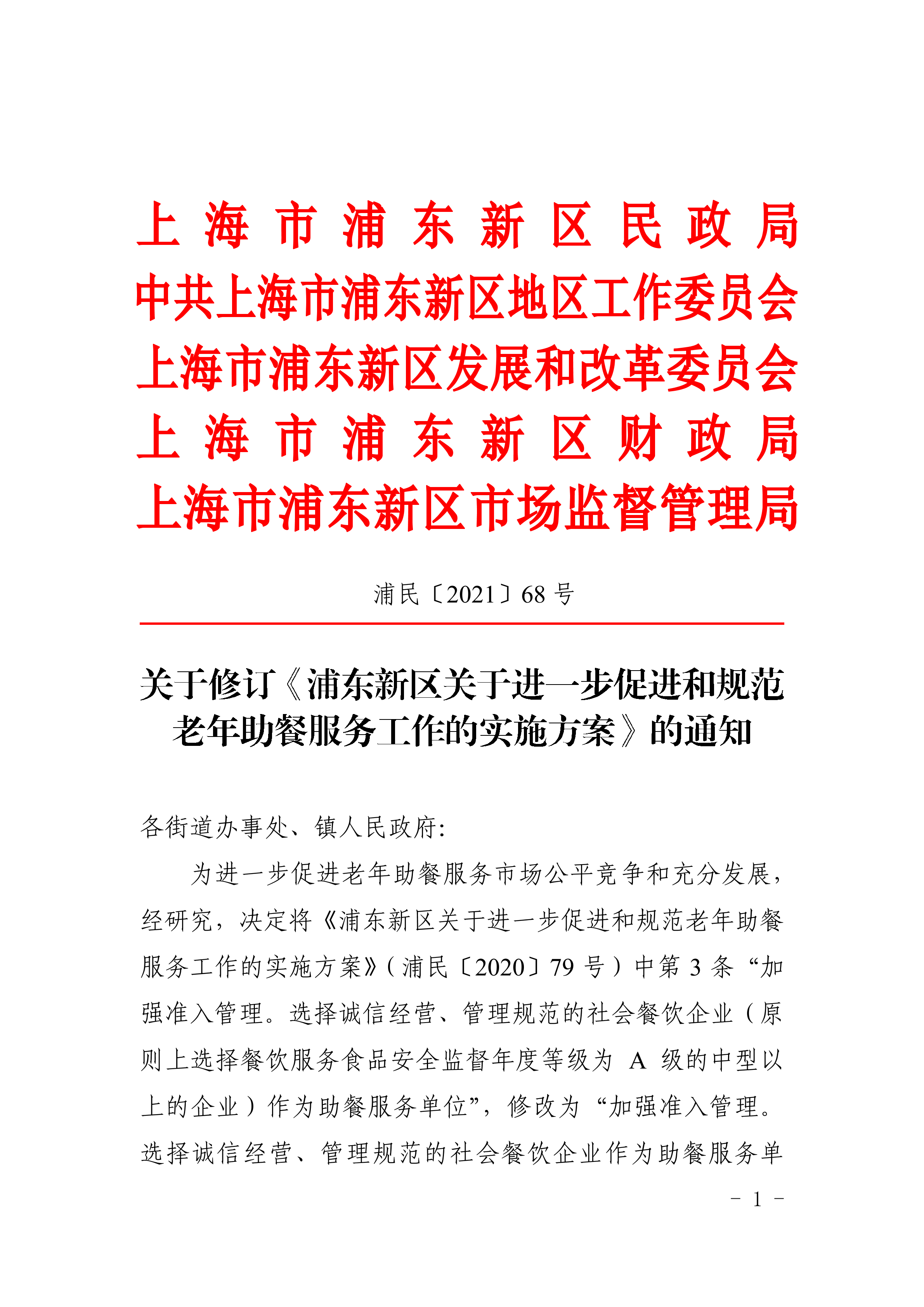 关于修订《浦东新区关于进一步促进和规范老年助餐服务工作的实施方案》的通知