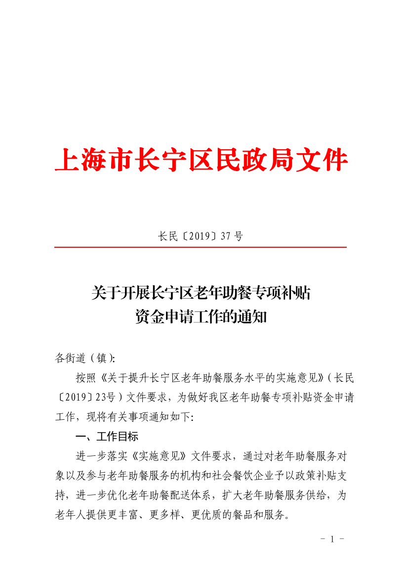 按照《关于提升长宁区老年助餐服务水平的实施意见》(长民〔2019〕23号)文件要求,为做好我区老年助餐专项补贴资金申请工作,现将有关事项通知如下: