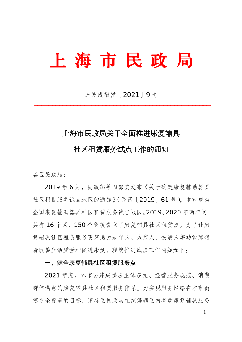 2019年6月,民政部等四部委发布《关于确定康复辅助器具社区租赁服务试点地区的通知》(民函〔2019〕61号),本市成为全国康复辅助器具社区租赁服务试点地区。2019、2020年两年间,共有16个区、150个街镇设立了康复辅具社区租赁点。为了让康复辅具社区租赁服务更好助力老年人、残疾人、伤病人等功能障碍者改善生活质量和促进康复,现就推进试点工作通知如下: