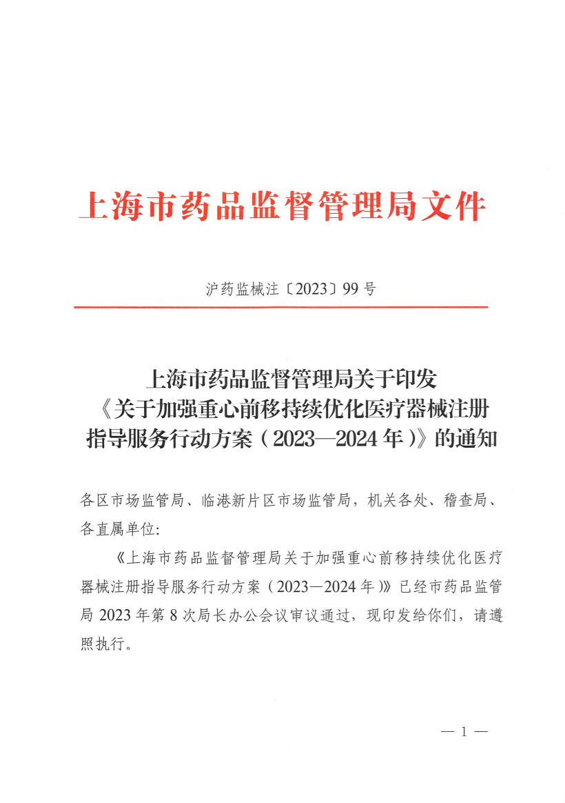 上海市药品监督管理局关于加强重心前移持续优化医疗器械注册指导服务行动方案(2023—2024年)