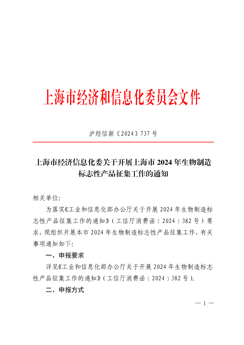详见《工业和信息化部办公厅关于开展2024年生物制造标志性产品征集工作的通知》(工信厅消费函﹝2024﹞382号)。