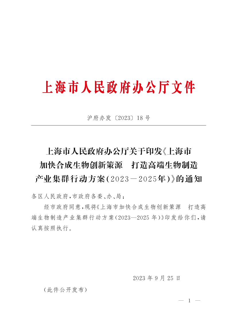 上海市人民政府办公厅关于印发《上海市加快合成生物创新策源 打造高端生物制造产业集群行动方案(2023-2025年)》的通知