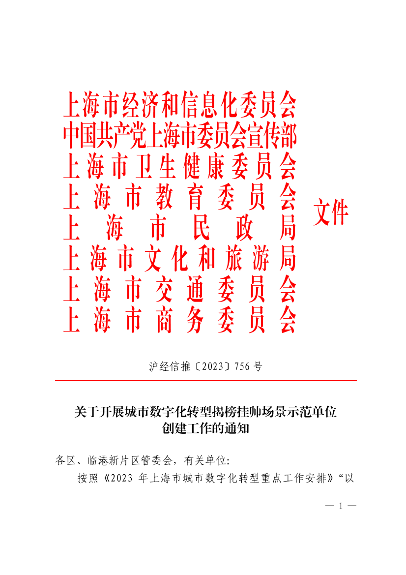 按照《2023年上海市城市数字化转型重点工作安排》“以信息化数字化驱动上海现代化建设”的总体要求,以数字技术创新和场景应用双牵引,打造智慧城市样板地,前期市经济信息化委、市委宣传部、市卫生健康委、市教委、市民政局、市文化旅游局、市交通委、市商务委组织了城市数字化转型重点场景示范任务(生活领域)揭榜挂帅工作(简称揭榜挂帅工作),为推动重点场景示范任务落地见效,本市将开展第一批城市数字化转型(生活领域)揭榜挂帅场景示范单位创建工作,现将有关事宜通知如下: