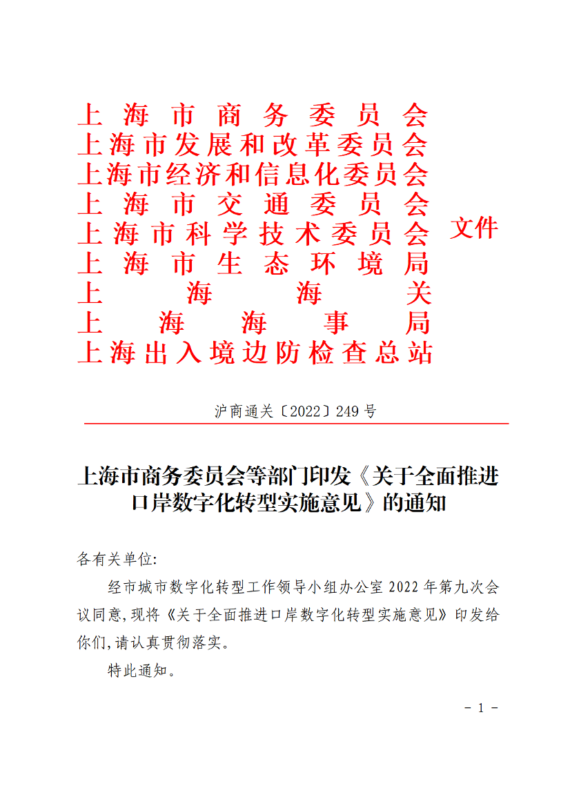 为全面推进本市智慧口岸建设,根据市委、市政府《关于全面推进上海城市数字化转型的意见》(沪委发〔2020〕35号)《推进上海经济数字化转型 赋能高质量发展行动方案(2021-2023年)》(沪数字化办〔2021〕1号)和《全面推进上海数字商务高质量发展实施意见》(沪商电商〔2021〕121号)等要求,特制定本实施意见。