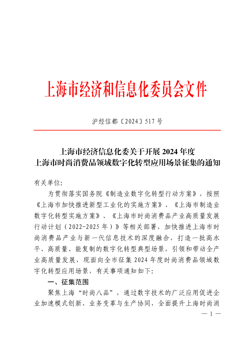 关于开展2024年度上海市时尚消费品领域数字化转型应用场景征集的通知