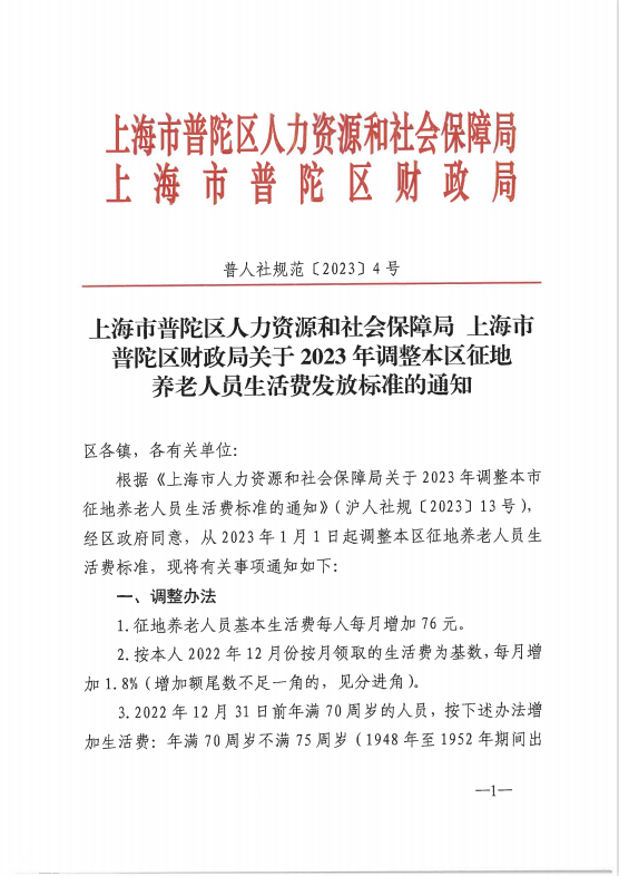 根据《上海市人力资源和社会保障局关于2023年调整本市征地养老人员生活费标准的通知》(沪人社规〔2023〕13号),经区政府同意,从2023年1月1日起调整本区征地养老人员生活费标准,现将有关事项通知如下:
