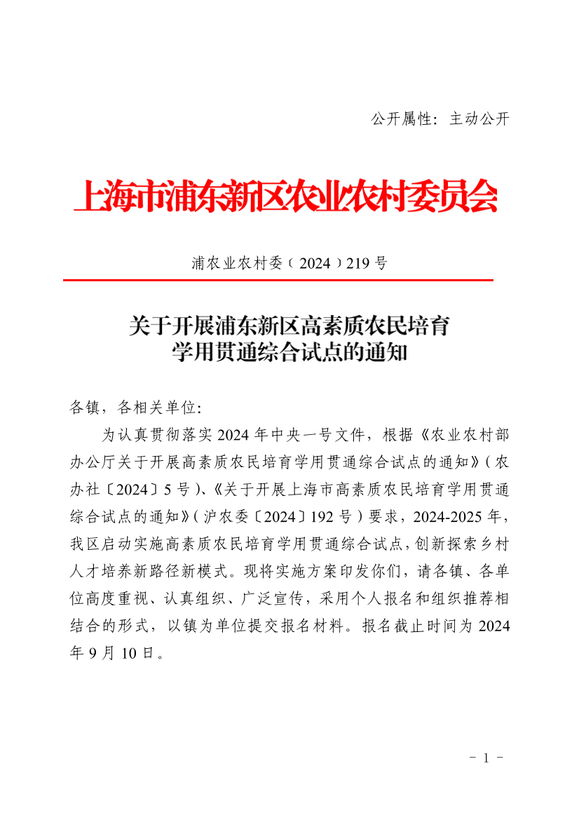 为认真贯彻落实2024年中央一号文件,根据《农业农村部办公厅关于开展高素质农民培育学用贯通综合试点的通知》(农办社〔2024〕5号)、《关于开展上海市高素质农民培育学用贯通综合试点的通知》(沪农委〔2024〕192号)要求,2024-2025年,我区启动实施高素质农民培育学用贯通综合试点,创新探索乡村人才培养新路径新模式。现将实施方案印发你们,请各镇、各单位高度重视、认真组织、广泛宣传,采用个人报名和组织推荐相结合的形式,以镇为单位提交报名材料。报名截止时间为2024年9月10日。