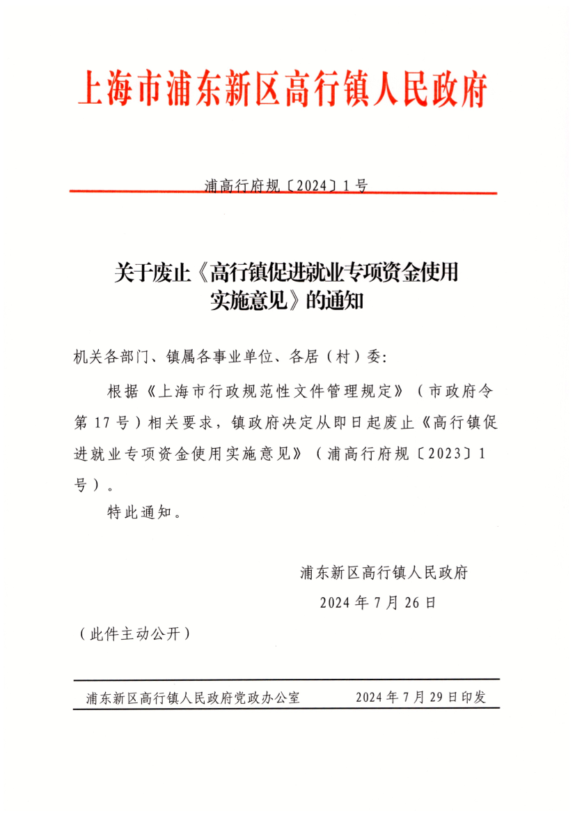 根据《上海市行政规范性文件管理规定》(市政府令第17号)相关要求,镇政府决定从即日起废止《高行镇促进就业专项资金使用实施意见》(浦高行府规〔2023〕1号)。
