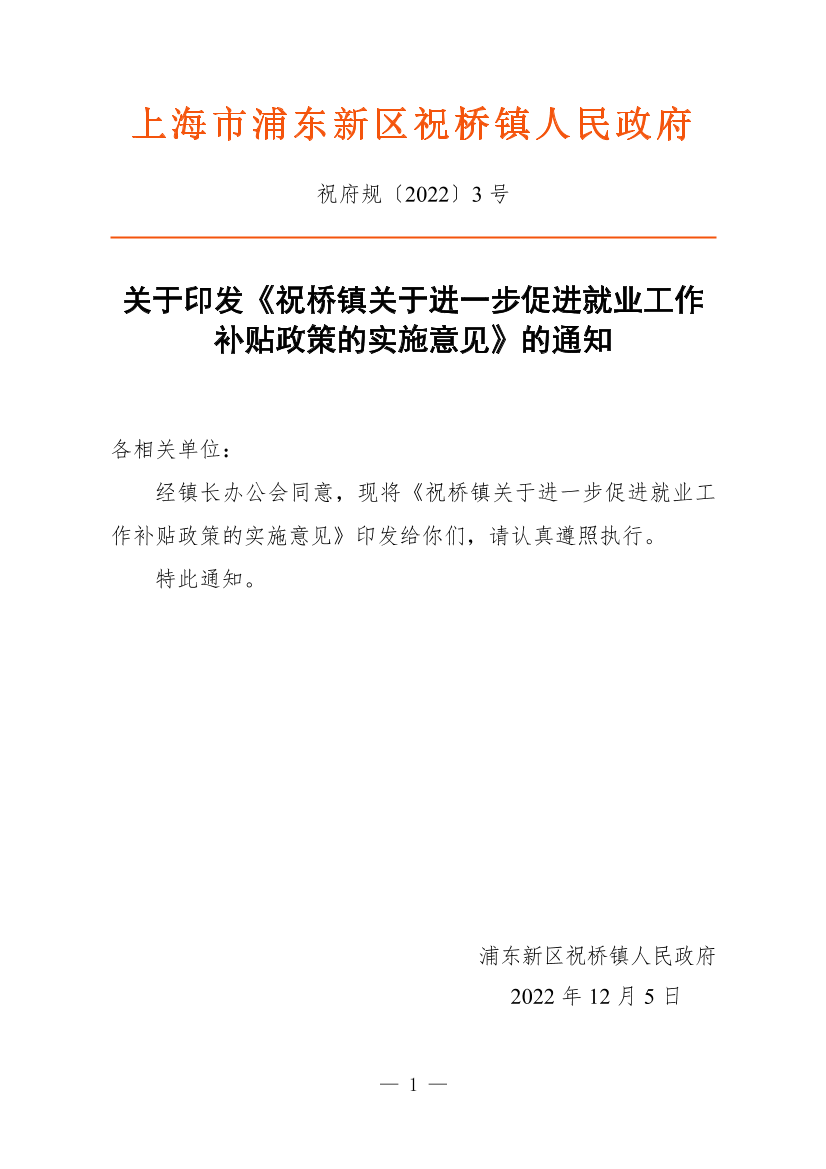 关于印发《祝桥镇关于进一步促进就业工作补贴政策的实施意见》的通知