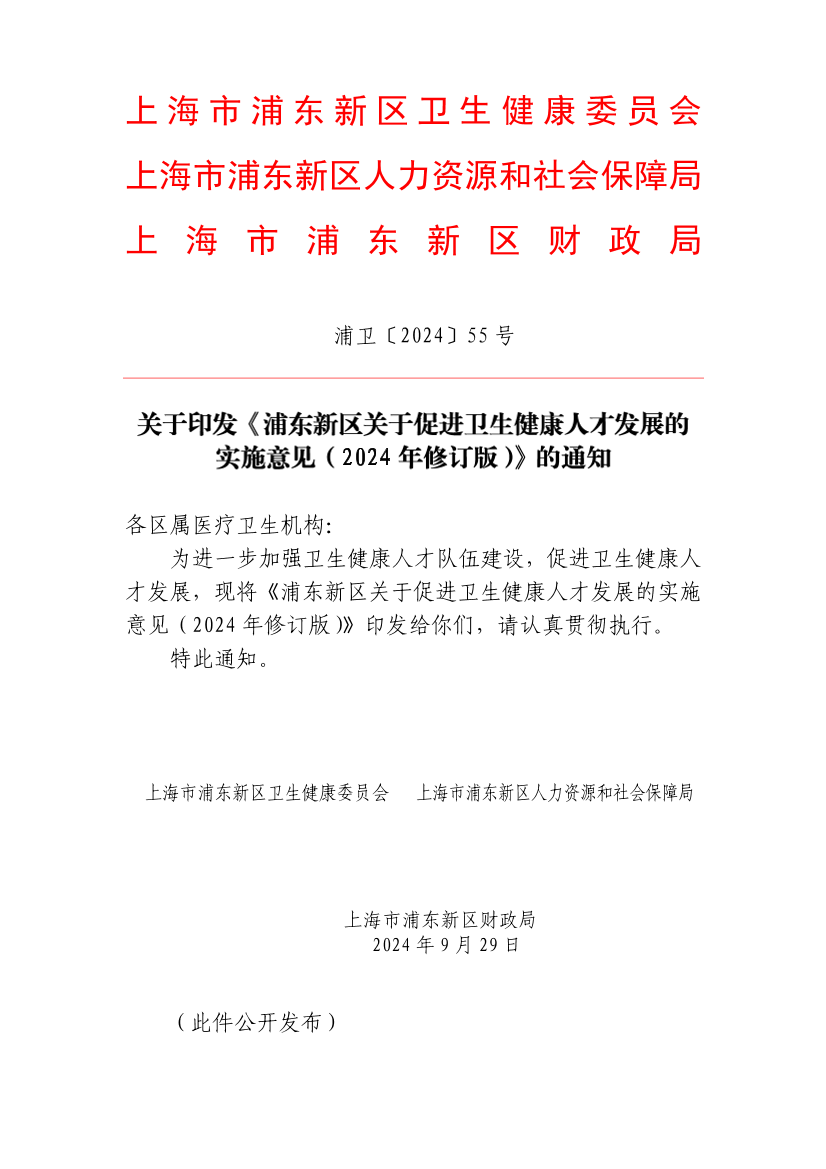 关于印发《浦东新区关于促进卫生健康人才发展的实施意见(2024年修订版)》的通知