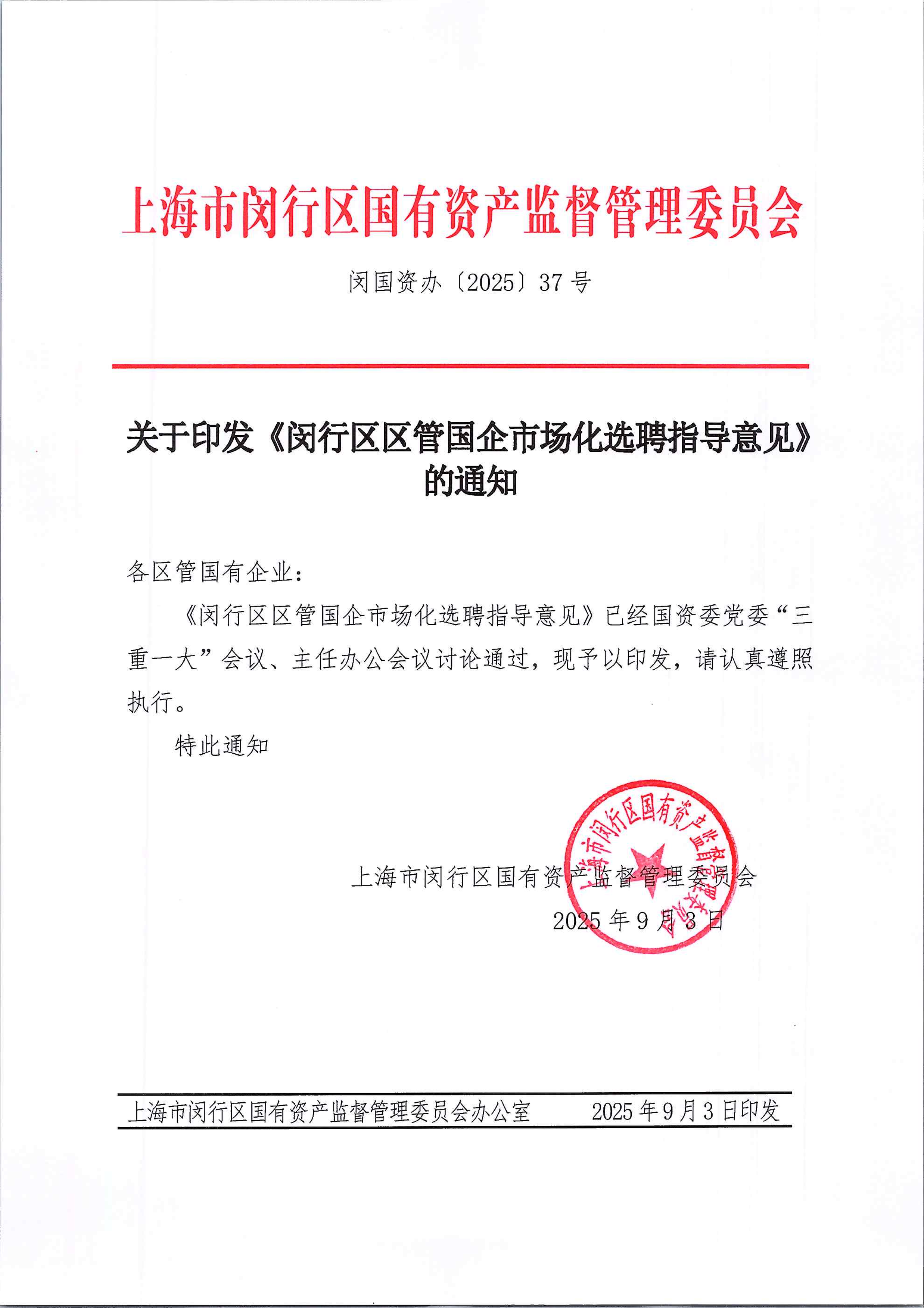 《闵行区区管国企市场化选聘指导意见》已经国资委党委“三重一大”会议、主任办公会议讨论通过,现予以印发,请认真遵照执行。
