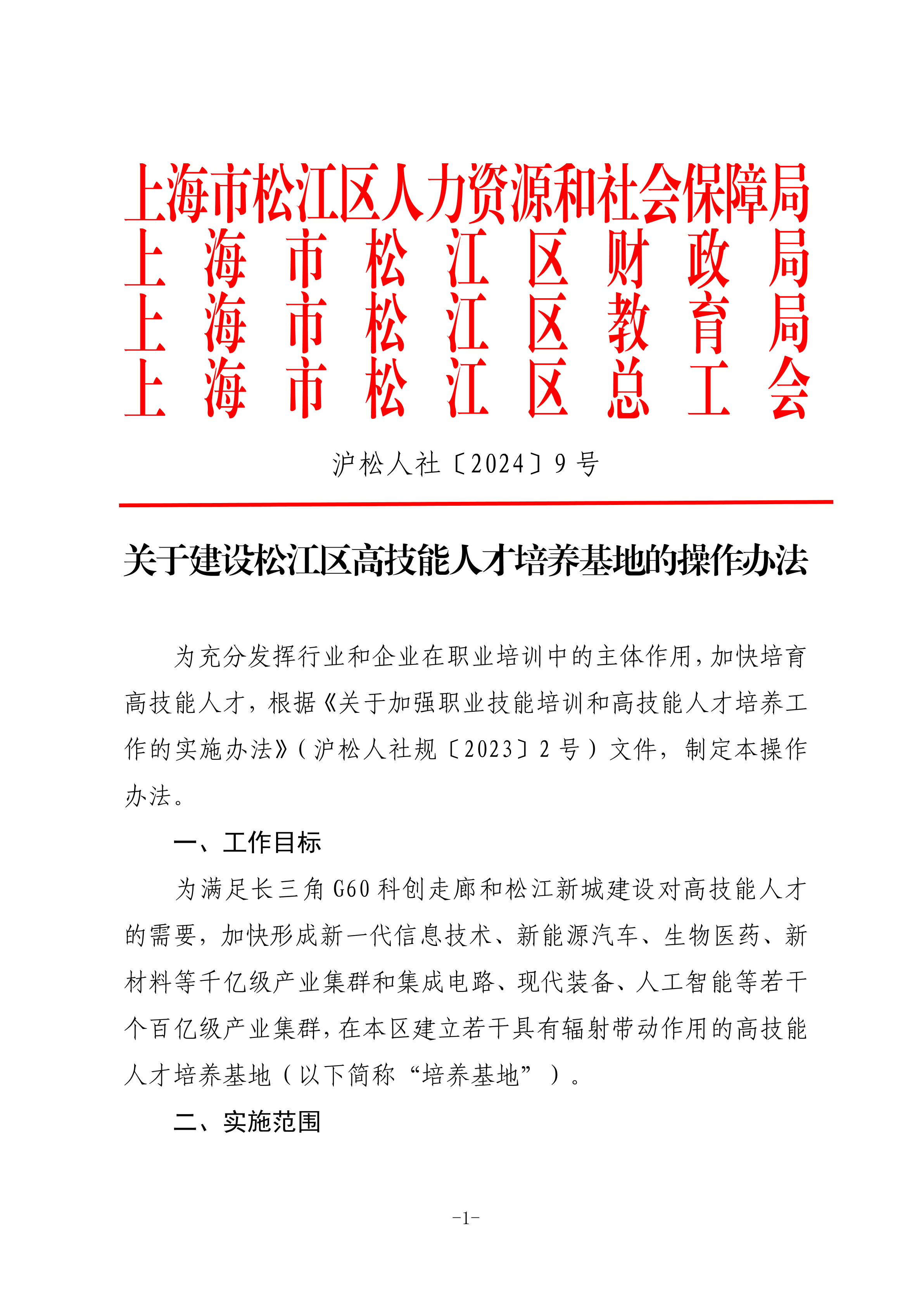 为满足长三角G60科创走廊和松江新城建设对高技能人才的需要,加快形成新一代信息技术、新能源汽车、生物医药、新材料等千亿级产业集群和集成电路、现代装备、人工智能等若干个百亿级产业集群,在本区建立若干具有辐射带动作用的高技能人才培养基地(以下简称“培养基地”)。