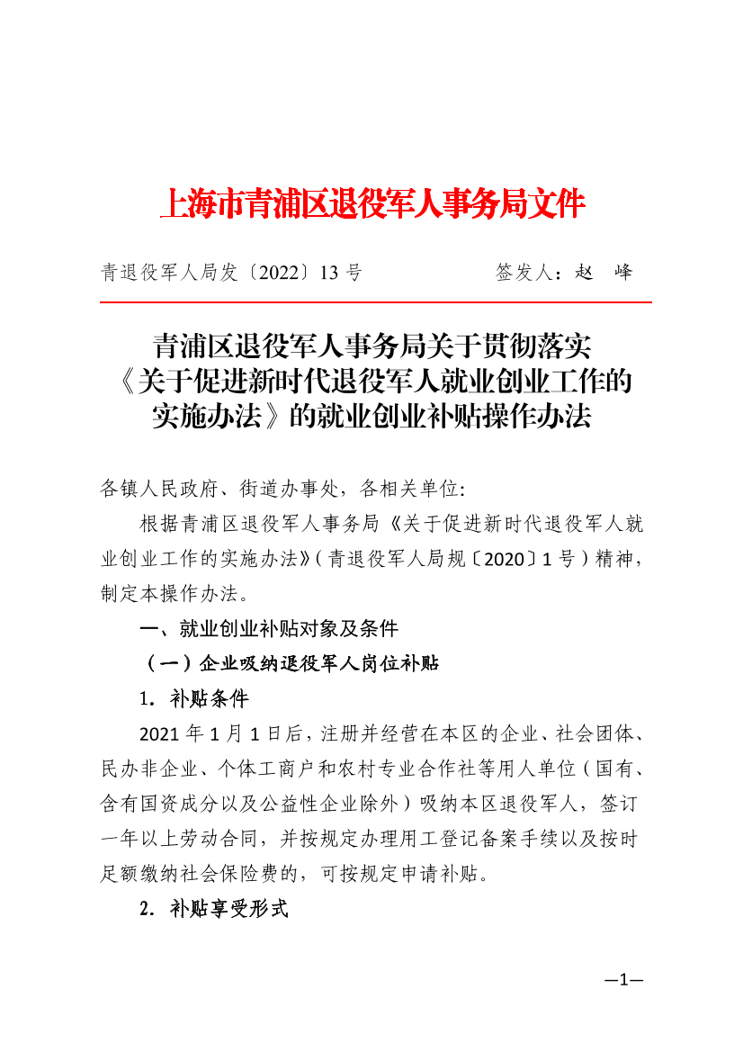 青浦区退役军人事务局关于贯彻落实《关于促进新时代退役军人就业创业工作的实施办法》的就业创业补贴操作办法