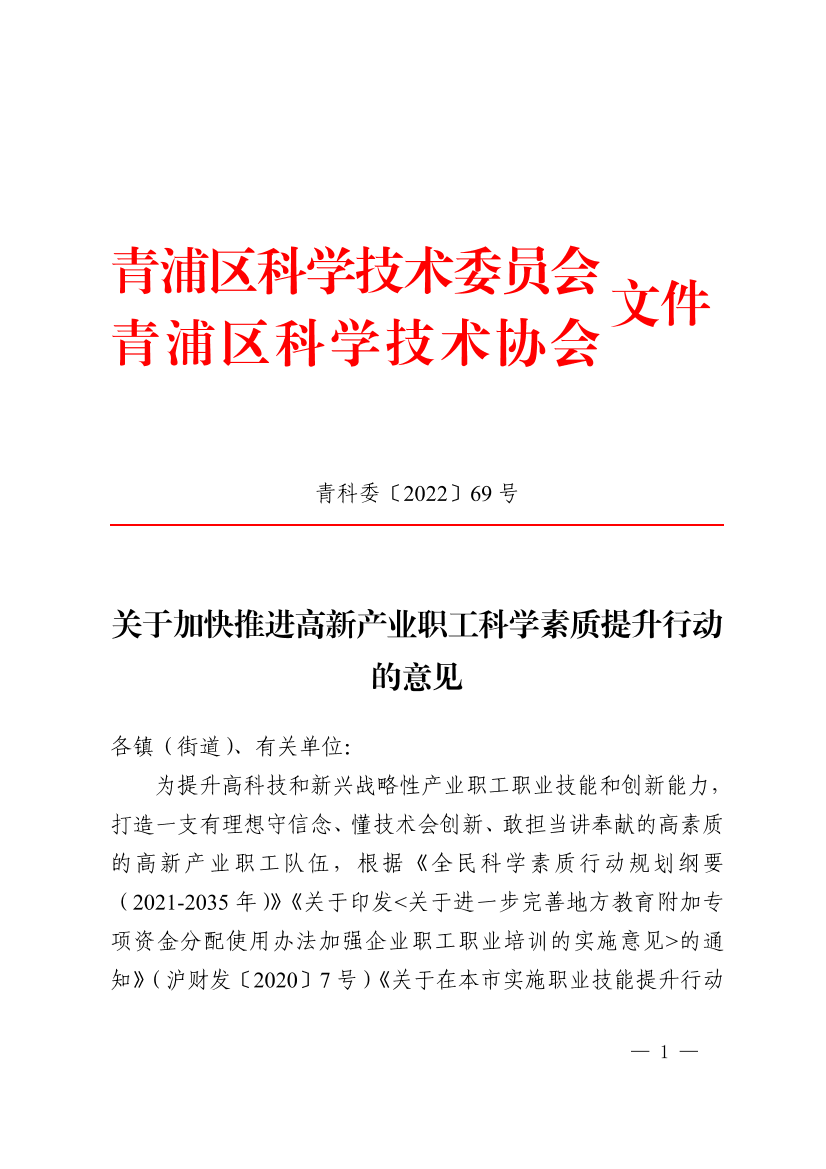 为提升高科技和新兴战略性产业职工职业技能和创新能力,打造一支有理想守信念、懂技术会创新、敢担当讲奉献的高素质的高新产业职工队伍,根据《全民科学素质行动规划纲要(2021-2035年)》《关于印发<关于进一步完善地方教育附加专项资金分配使用办法加强企业职工职业培训的实施意见>的通知》(沪财发〔2020〕7号)《关于在本市实施职业技能提升行动“互联网+职业技能培训计划”的 通知》(沪人社〔2020〕395号)等相关规定,结合本区实际,提出本意见。
