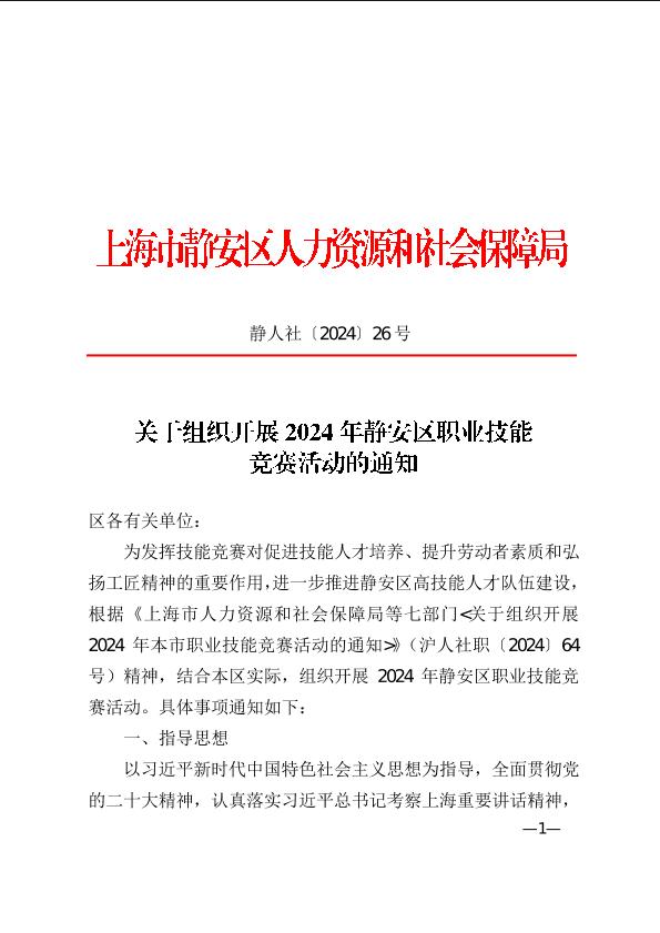 为发挥技能竞赛对促进技能人才培养、提升劳动者素质和弘扬工匠精神的重要作用,进一步推进静安区高技能人才队伍建设,根据《上海市人力资源和社会保障局等七部门<关于组织开展 2024年本市职业技能竞赛活动的通知>》(沪人社职〔2024〕64号)精神,结合本区实际,组织开展 2024年静安区职业技能竞赛活动。具体事项通知如下: