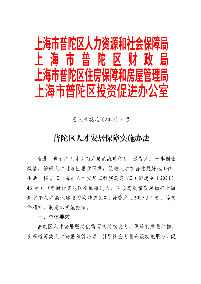 为进一步发挥人才引领发展的战略作用,激发人才干事创业激情,缓解人才过渡性居住困难,促进人才在普陀更好地工作、生活,根据《上海市人才安居工程实施意见》(沪建委〔2021〕46号)、《新时代普陀区全面推进人才引领高质量发展助推上海高水平人才高地建设的实施意见》(普委发〔2023〕4号)等文件精神,制定本实施办法。