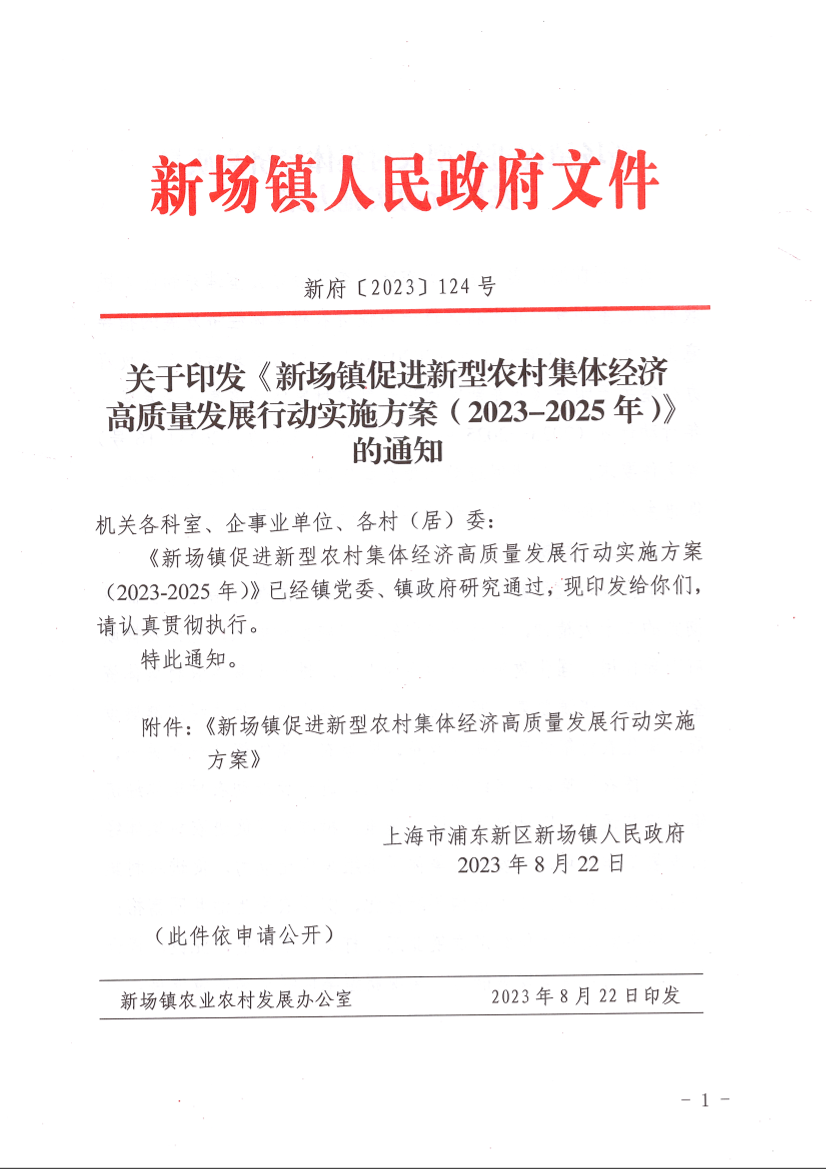 关于印发《新场镇促进新型农村集体经济高质量发展行动实施方案(2023-2025年)》的通知