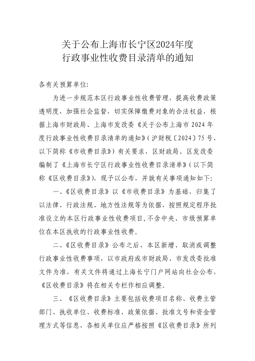 为进一步规范本区行政事业性收费管理,提高收费政策透明度,加强社会监督,切实保障缴费对象的合法权益,根据上海市财政局、上海市发改委《关于公布上海市2024年度行政事业性收费目录清单的通知》(沪财税〔2024〕75号,以下简称《市收费目录》)有关要求,区财政局、区发改委编制了《上海市长宁区行政事业性收费目录清单》(以下简称《区收费目录》),现予以公布,并就有关事项通知如下: