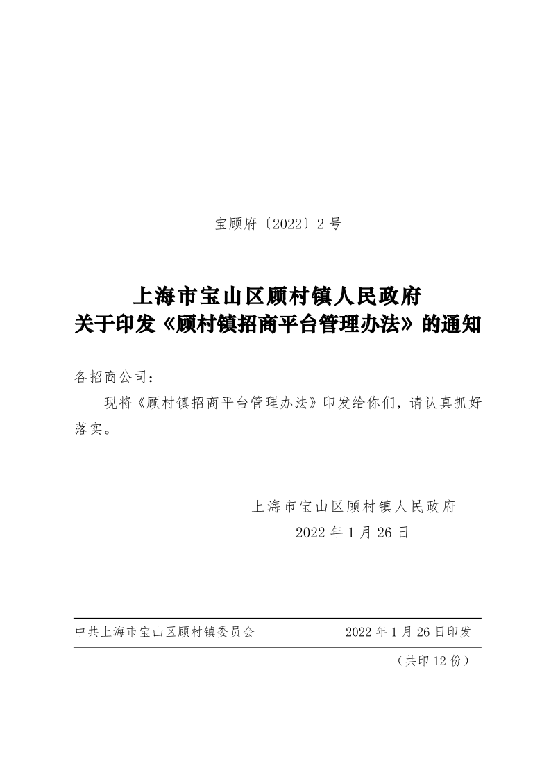 宝山区顾村镇人民政府关于印发《顾村镇招商平台管理办法》的通知