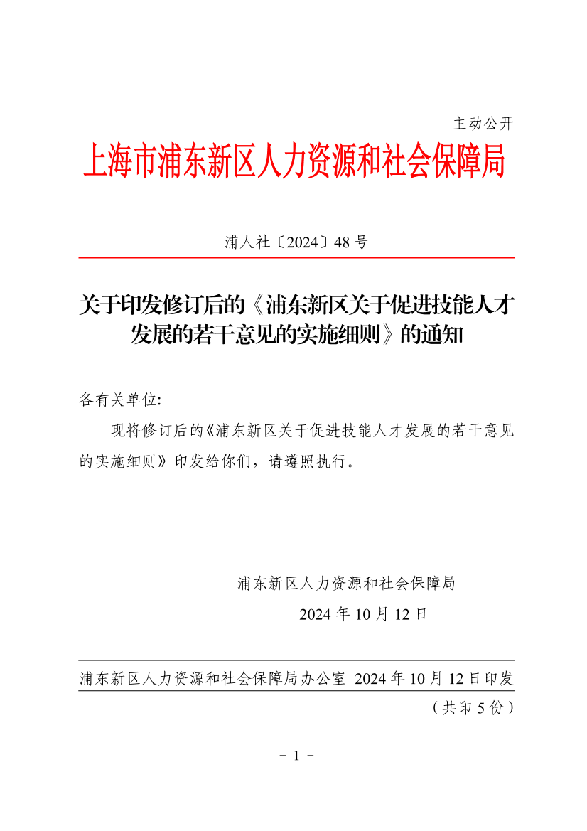 关于印发修订后的《浦东新区关于促进技能人才发展的若干意见的实施细则》的通知