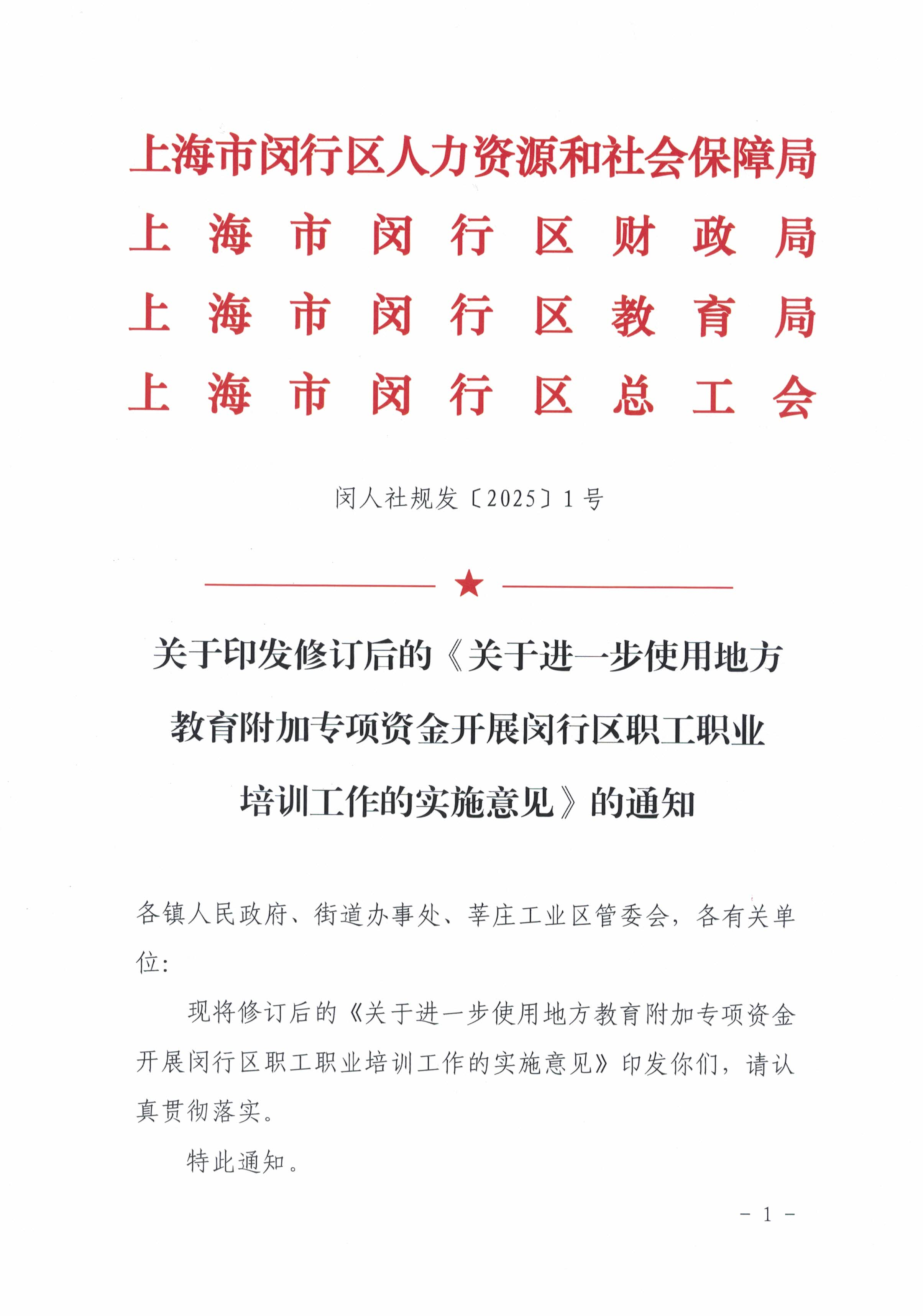 关于印发修订后的《关于进一步使用地方教育附加专项资金开展闵行区职工职业培训工作的实施意见》的通知
