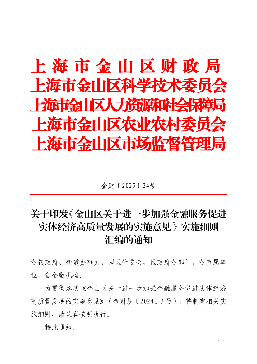 为贯彻落实《金山区关于进一步加强金融服务促进实体经济高质量发展的实施意见》(金财规〔2024〕3号),特制定相关实施细则,请认真按照执行。