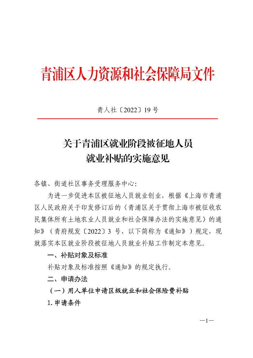 关于青浦区就业阶段被征地人员就业补贴的实施意见