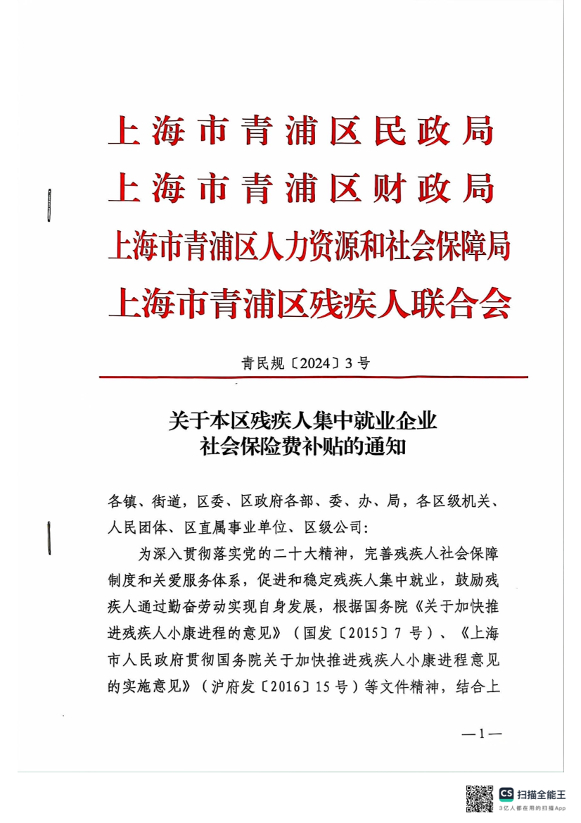为深入贯彻落实党的二十大精神,完善残疾人社会保障制度和关爱服务体系,促进和稳定残疾人集中就业,鼓励残疾人通过勤奋劳动实现自身发展,根据国务院《关于加快推进残疾人小康进程的意见》(国发〔2015〕7号)、《上海市人民政府贯彻国务院关于加快推进残疾人小康进程意见的实施意见》(沪府发〔2016〕15号)等文件精神,结合上海市民政局、上海市财政局、上海市人社局与上海市残疾人联合会联合发文《关于本市残疾人集中就业企业社会保险费补贴的通知》(沪民规〔2023〕19号)的文件要求,现就本区实施残疾人集中就业企业社会保险费补贴有关事项通知如下: