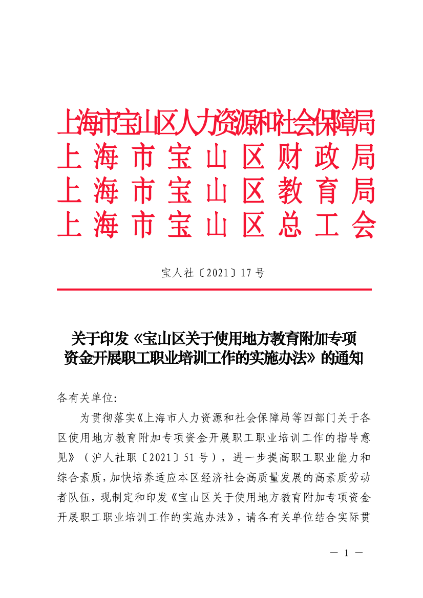 关于印发《宝山区关于使用地方教育附加专项资金开展职工职业培训工作的实施办法》的通知