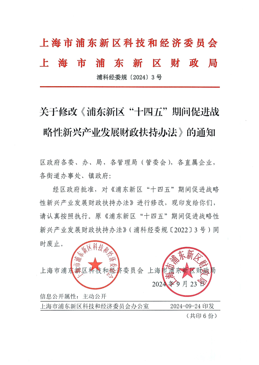 经区政府批准,对《浦东新区“十四五”期间促进战略性新兴产业发展财政扶持办法》进行修改,现印发给你们,请认真按照执行。原《浦东新区“十四五”期间促进战略性新兴产业发展财政扶持办法》(浦科经委规〔2022〕3号)同时废止。