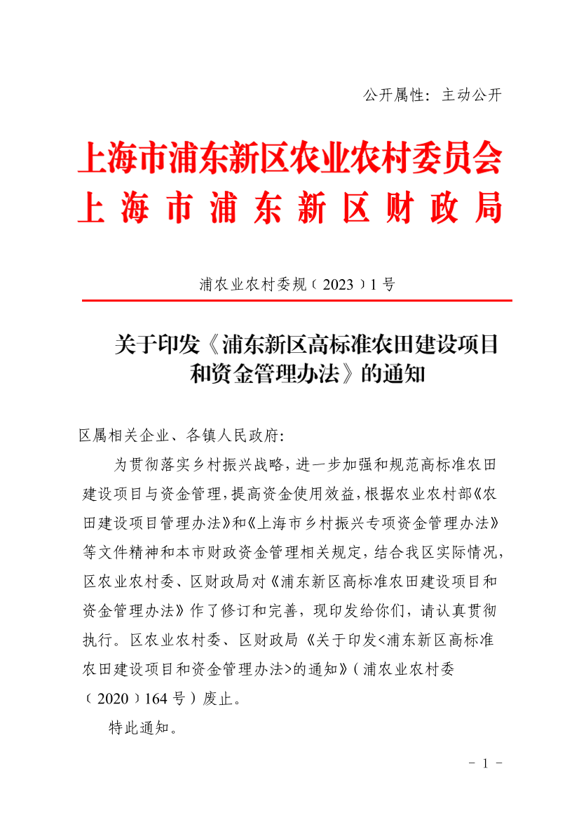 为贯彻落实乡村振兴战略,进一步加强和规范高标准农田建设项目与资金管理,提高资金使用效益,根据农业农村部《农田建设项目管理办法》和《上海市乡村振兴专项资金管理办法》等文件精神和本市财政资金管理相关规定,结合我区实际情况,区农业农村委、区财政局对《浦东新区高标准农田建设项目和资金管理办法》作了修订和完善,现印发给你们,请认真贯彻执行。区农业农村委、区财政局《关于印发<浦东新区高标准农田建设项目和资金管理办法>的通知》(浦农业农村委﹝2020﹞164号)废止。