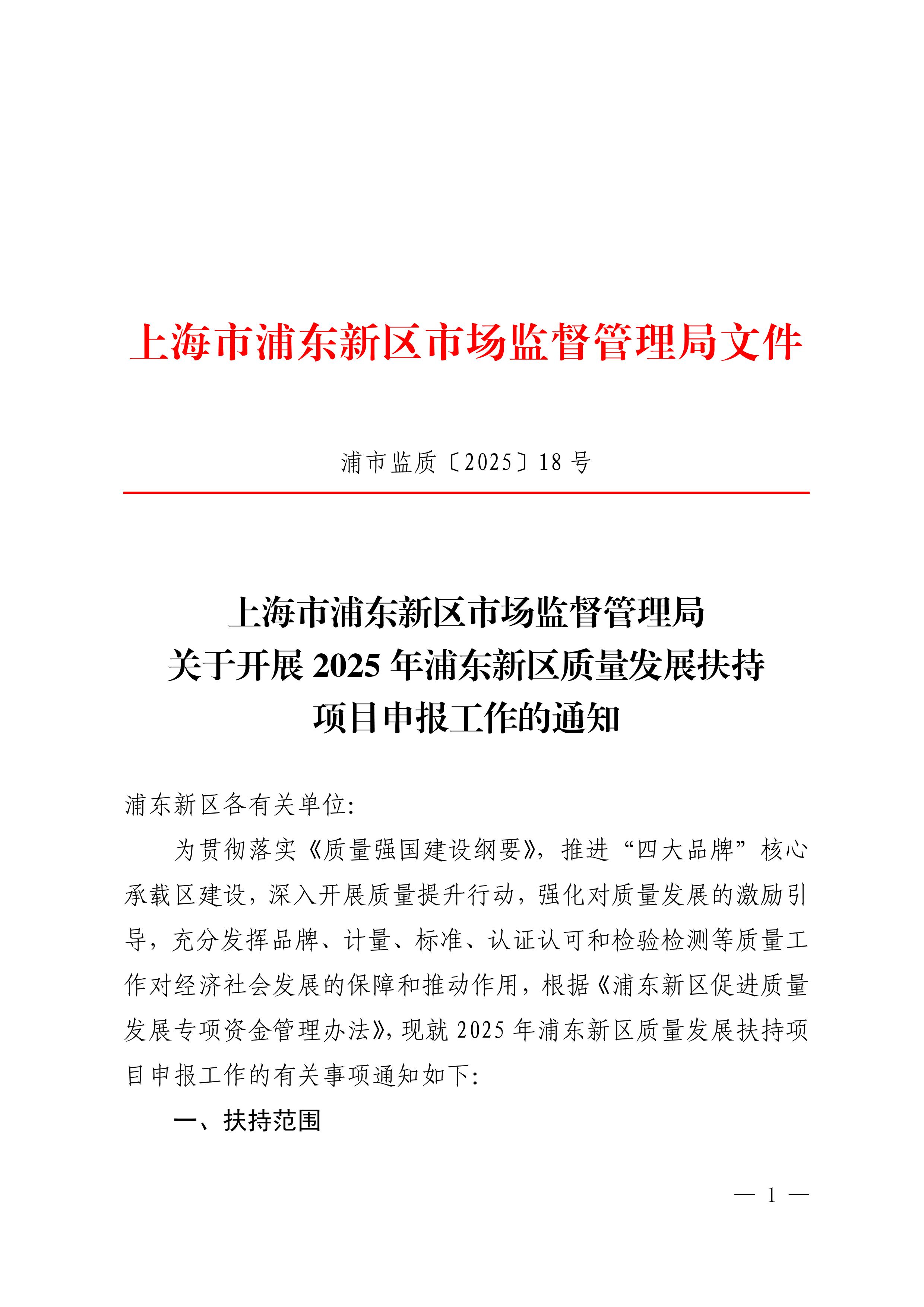 上海市浦东新区市场监督管理局关于开展2025年浦东新区质量发展扶持项目申报工作的通知