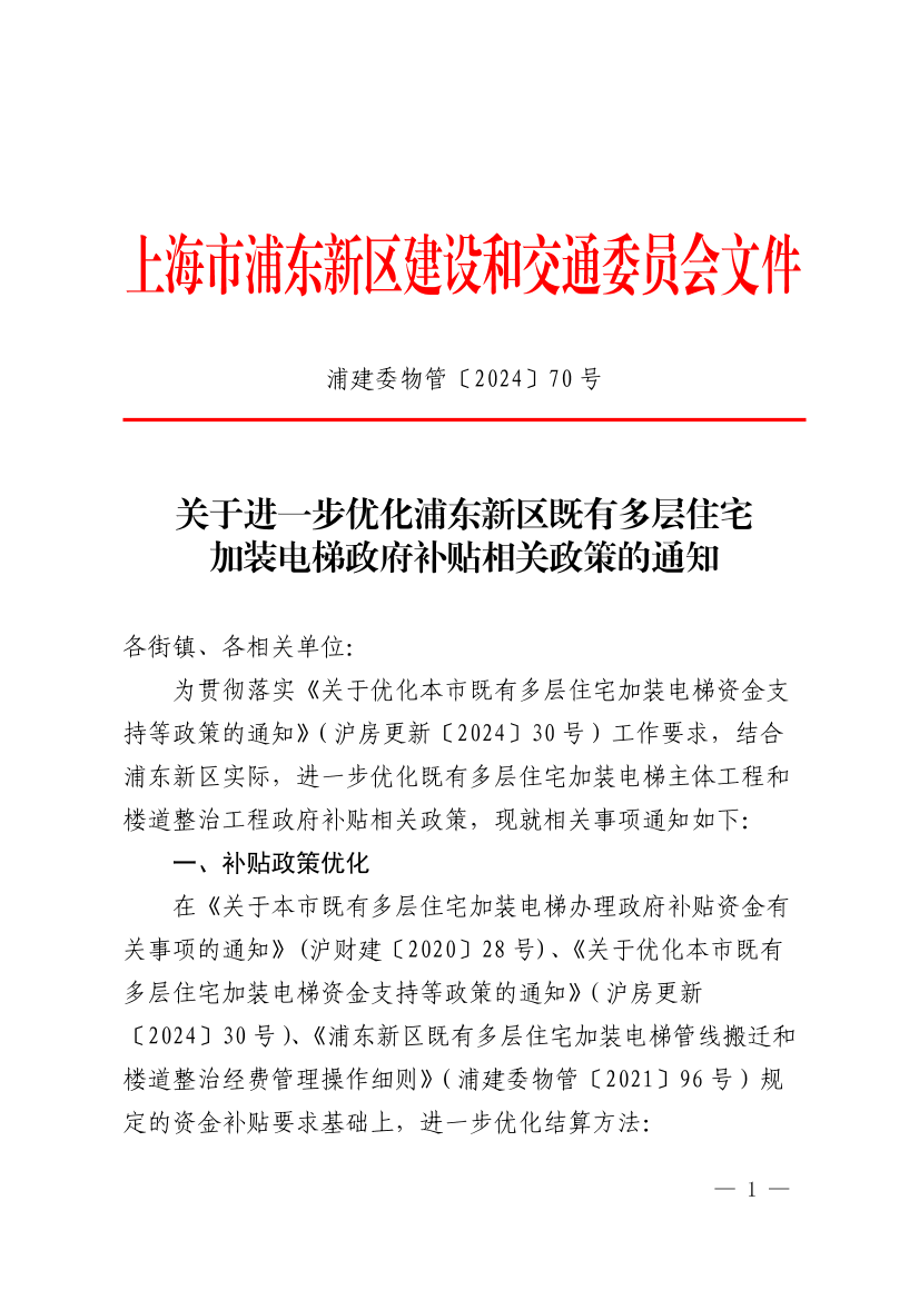 为贯彻落实《关于优化本市既有多层住宅加装电梯资金支持等政策的通知》(沪房更新〔2024〕30号)工作要求,结合浦东新区实际,进一步优化既有多层住宅加装电梯主体工程和楼道整治工程政府补贴相关政策,现就相关事项通知如下:
