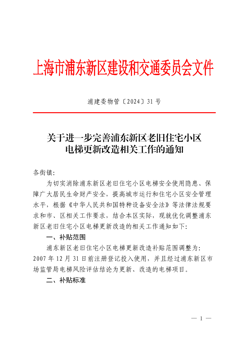 为切实消除浦东新区老旧住宅小区电梯安全使用隐患、保障广大居民生命财产安全,提高城市运行和住宅小区安全管理水平,根据《中华人民共和国特种设备安全法》等法律法规要求和市、区相关工作要求,结合本区实际,现就优化调整浦东新区老旧住宅小区电梯更新改造的相关工作通知如下: