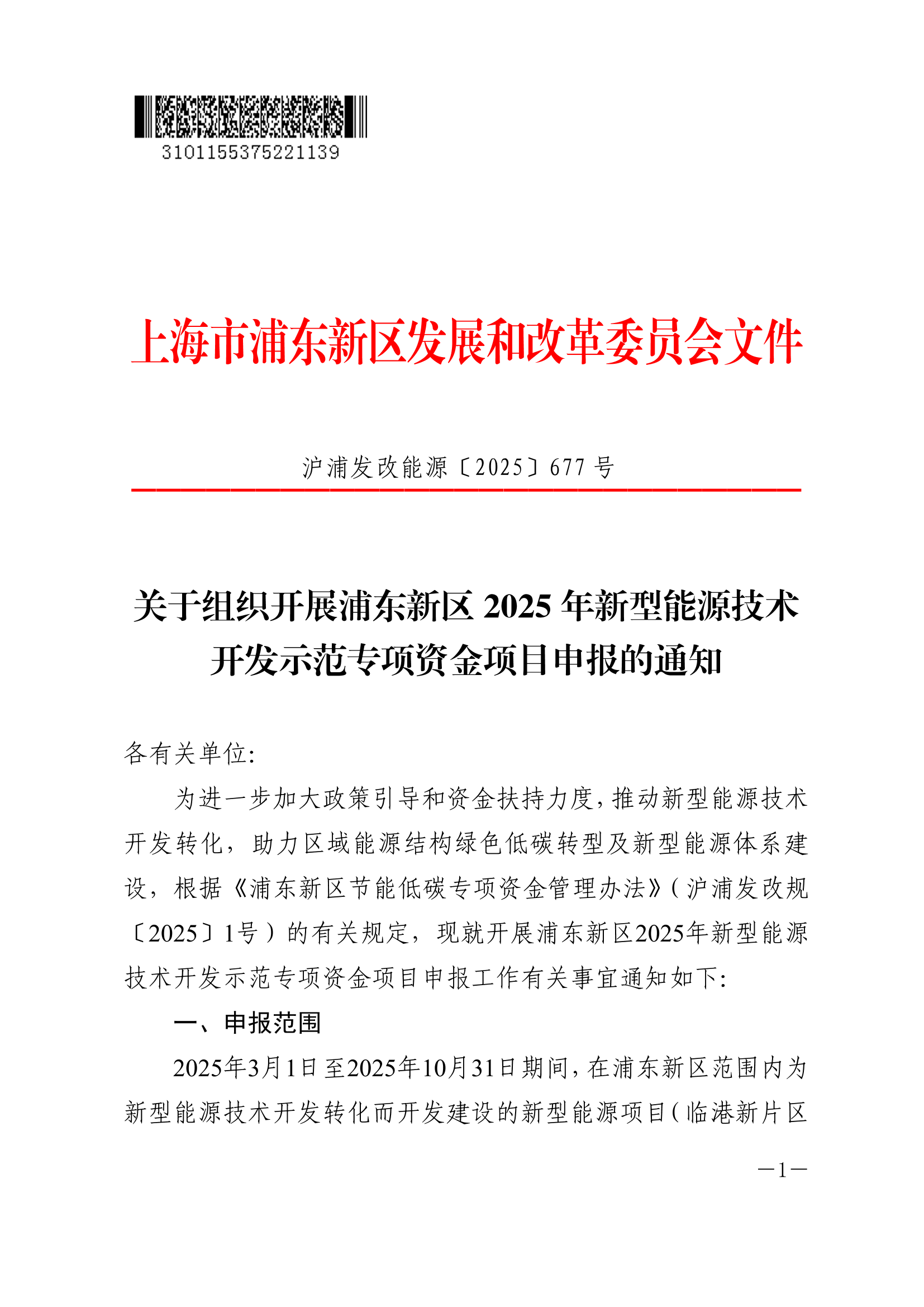 为进一步加大政策引导和资金扶持力度,推动新型能源技术开发转化,助力区域能源结构绿色低碳转型及新型能源体系建设,根据《浦东新区节能低碳专项资金管理办法》(沪浦发改规〔2025〕1号)的有关规定,现就开展浦东新区2025年新型能源技术开发示范专项资金项目申报工作有关事宜通知如下: