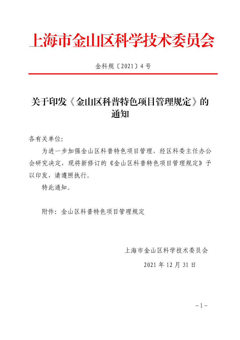 为进一步加强金山区科普特色项目管理,经区科委主任办公会研究决定,现将新修订的《金山区科普特色项目管理规定》予以印发,请遵照执行。