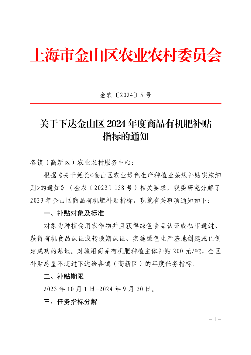 根据《关于延长<金山区农业绿色生产种植业条线补贴实施细则>的通知》(金农﹝2023﹞158号)相关要求,我委研究分解了2023年金山区商品有机肥补贴指标,现就有关事项通知如下: