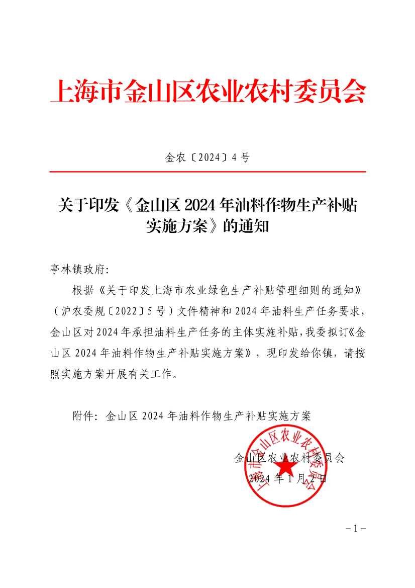 根据《关于印发上海市农业绿色生产补贴管理细则的通知》(沪农委规〔2022〕5号)文件精神和2024年油料生产任务要求,金山区对2024年承担油料生产任务的主体实施补贴,我委拟订《金山区2024年油料作物生产补贴实施方案》,现印发给你镇,请按照实施方案开展有关工作。