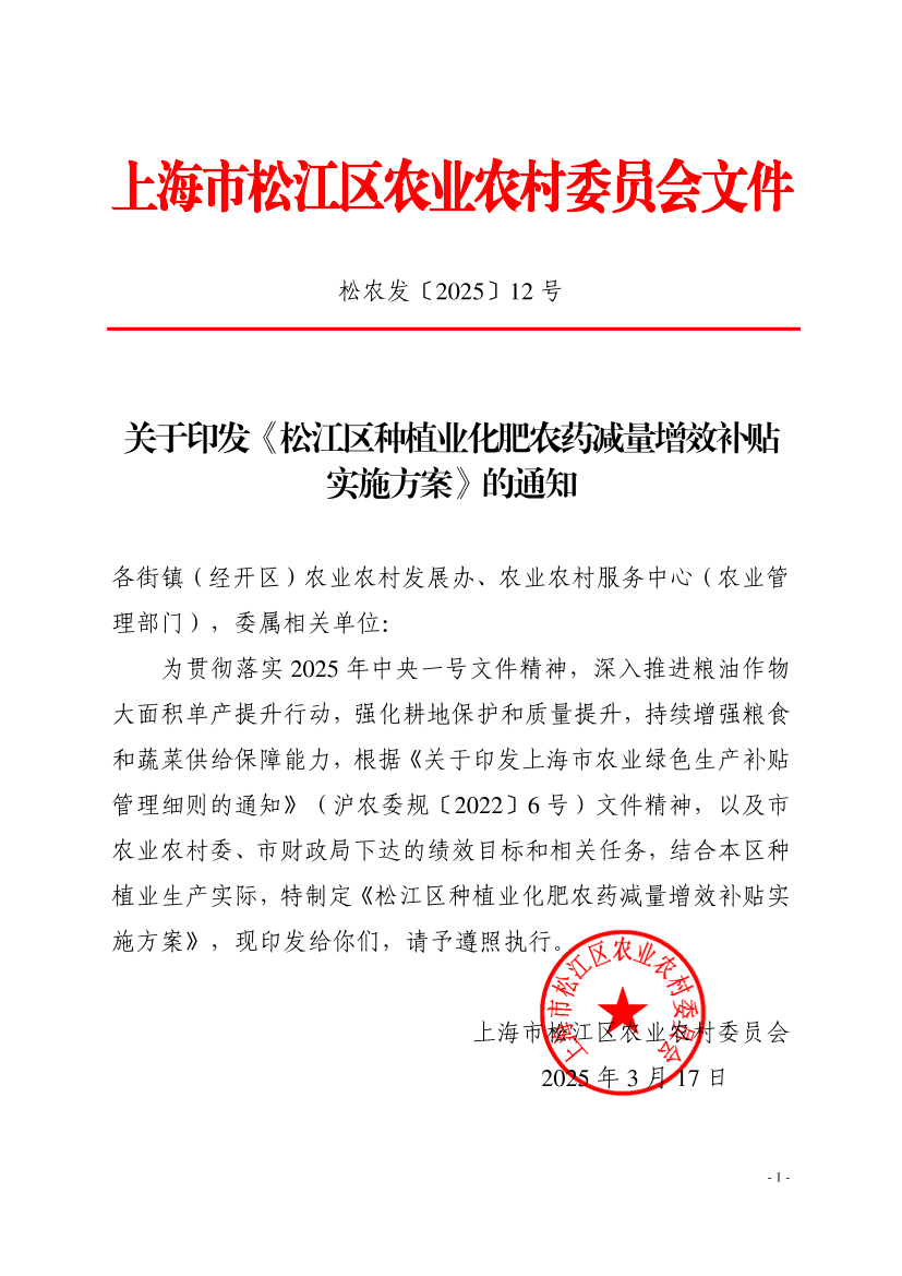为贯彻落实2025年中央一号文件精神,深入推进粮油作物大面积单产提升行动,强化耕地保护和质量提升,持续增强粮食和蔬菜供给保障能力,根据《关于印发上海市农业绿色生产补贴管理细则的通知》(沪农委规〔2022〕6号)文件精神,以及市农业农村委、市财政局下达的绩效目标和相关任务,结合本区种植业生产实际,特制定《松江区种植业化肥农药减量增效补贴实施方案》,现印发给你们,请予遵照执行。