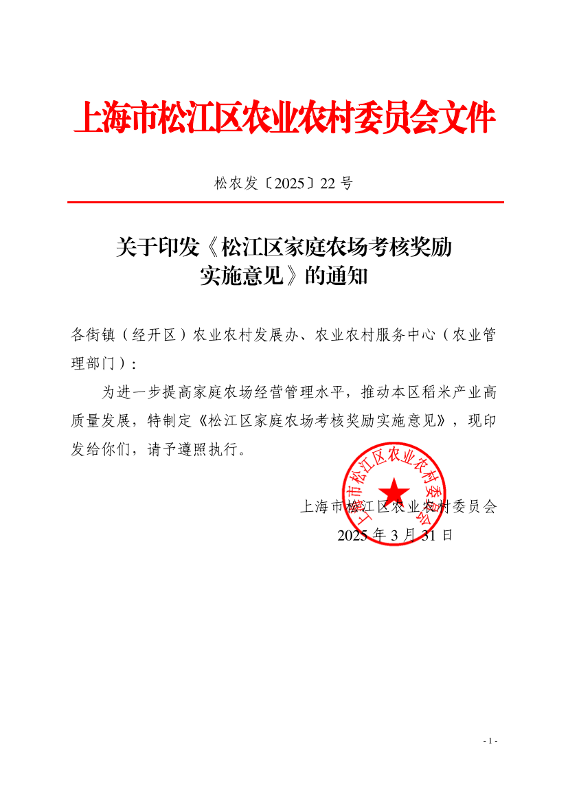 为进一步提高家庭农场经营管理水平,推动本区稻米产业高质量发展,特制定《松江区家庭农场考核奖励实施意见》,现印发给你们,请予遵照执行。