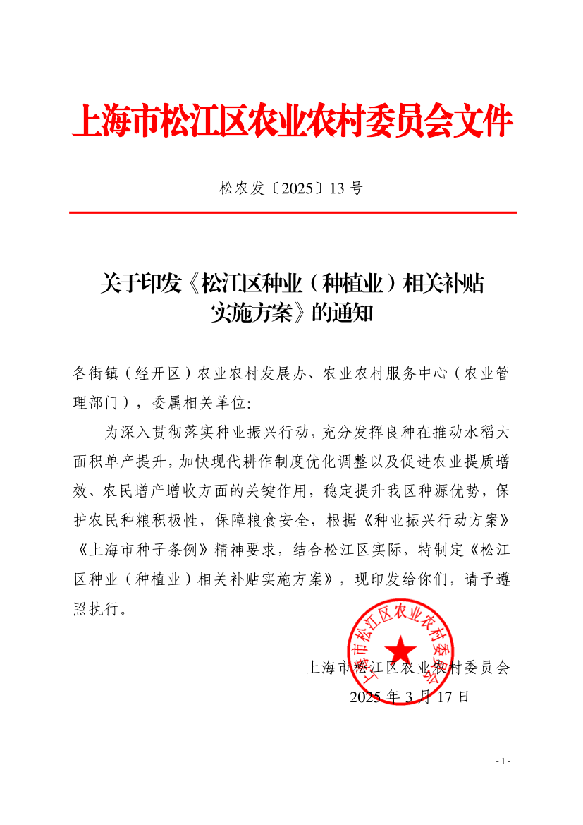 关于印发《松江区种业(种植业)相关补贴实施方案》的通知