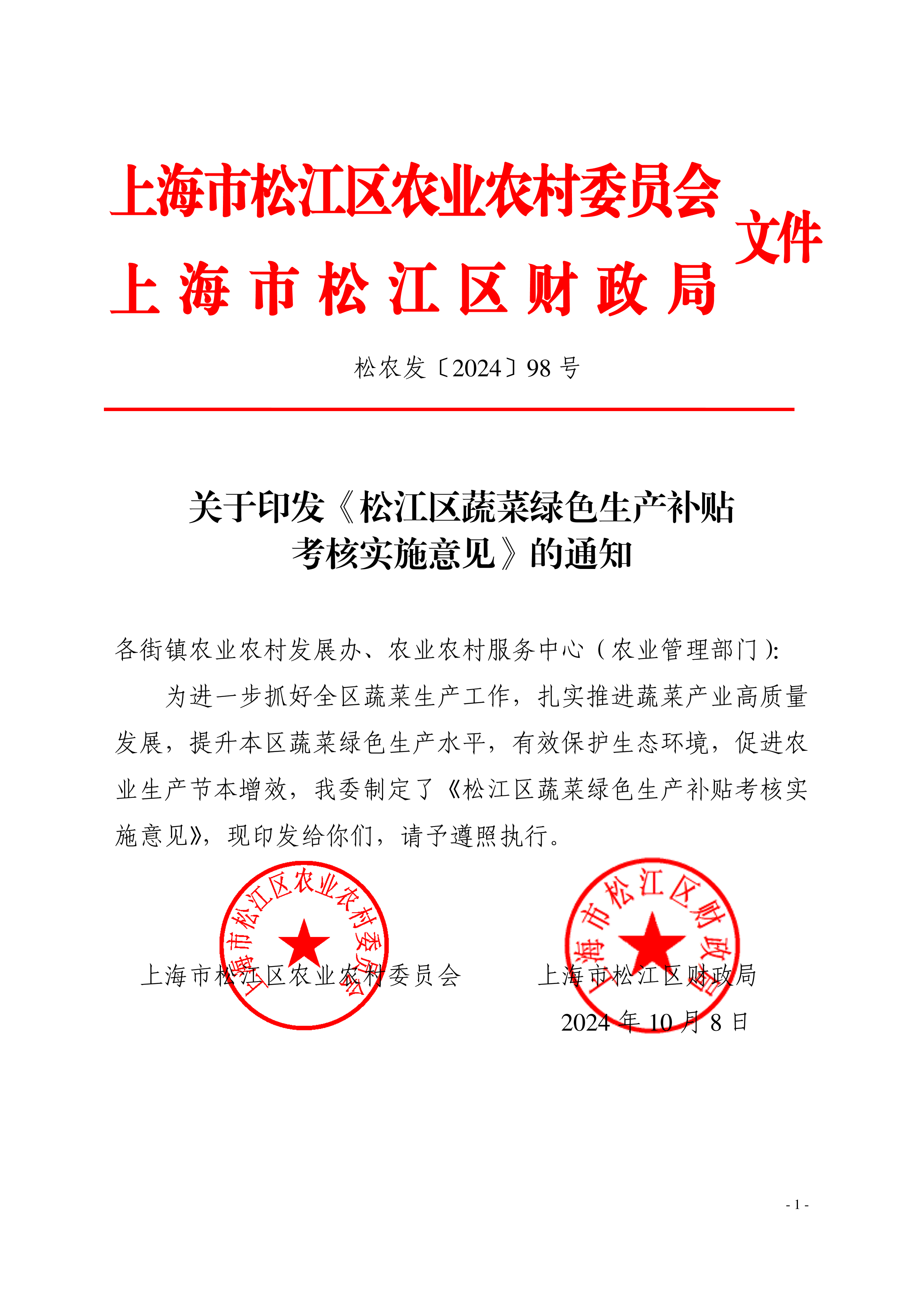 关于印发《松江区蔬菜绿色生产补贴考核实施意见》的通知
