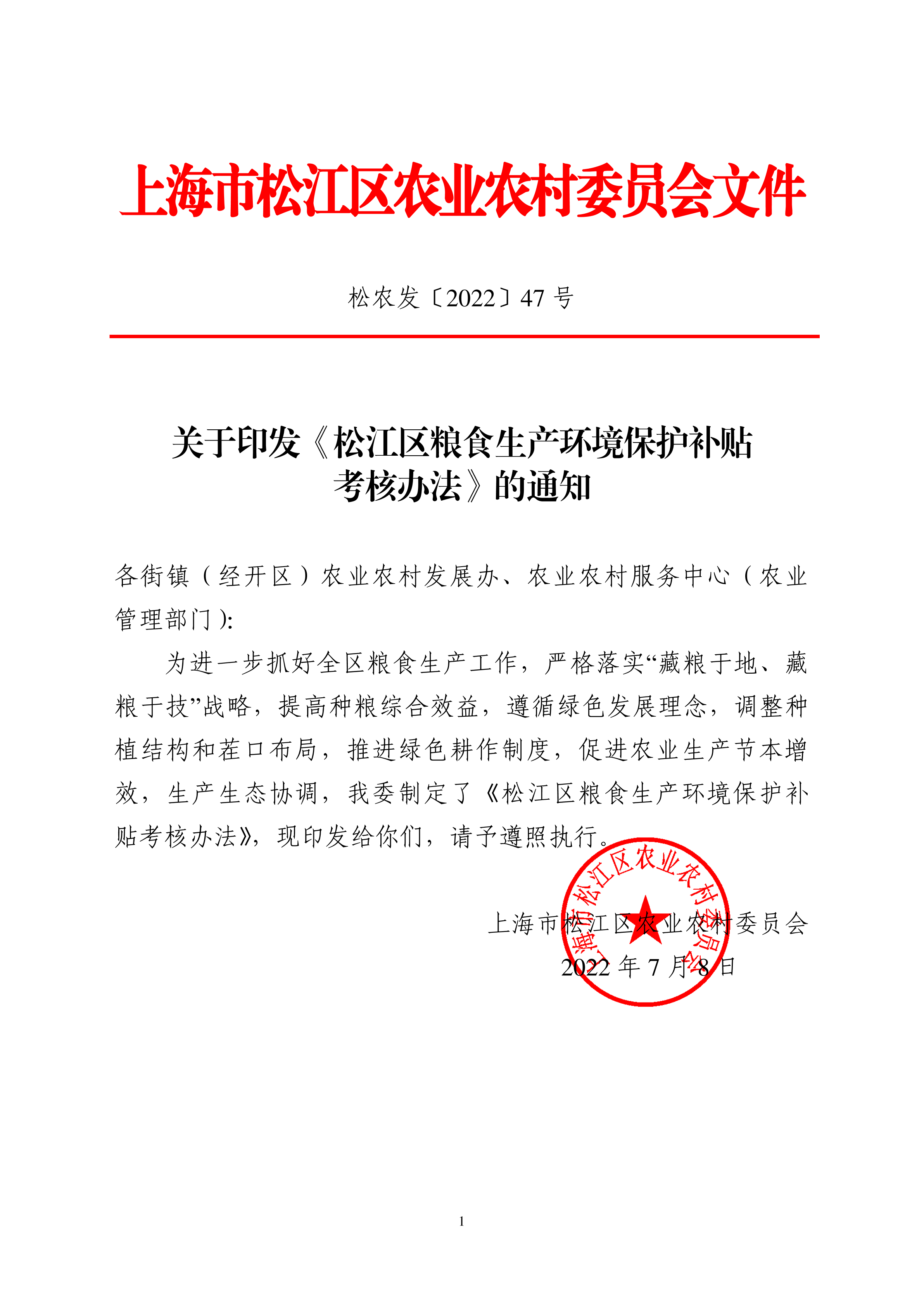 关于印发《松江区粮食生产环境保护补贴考核办法》的通知