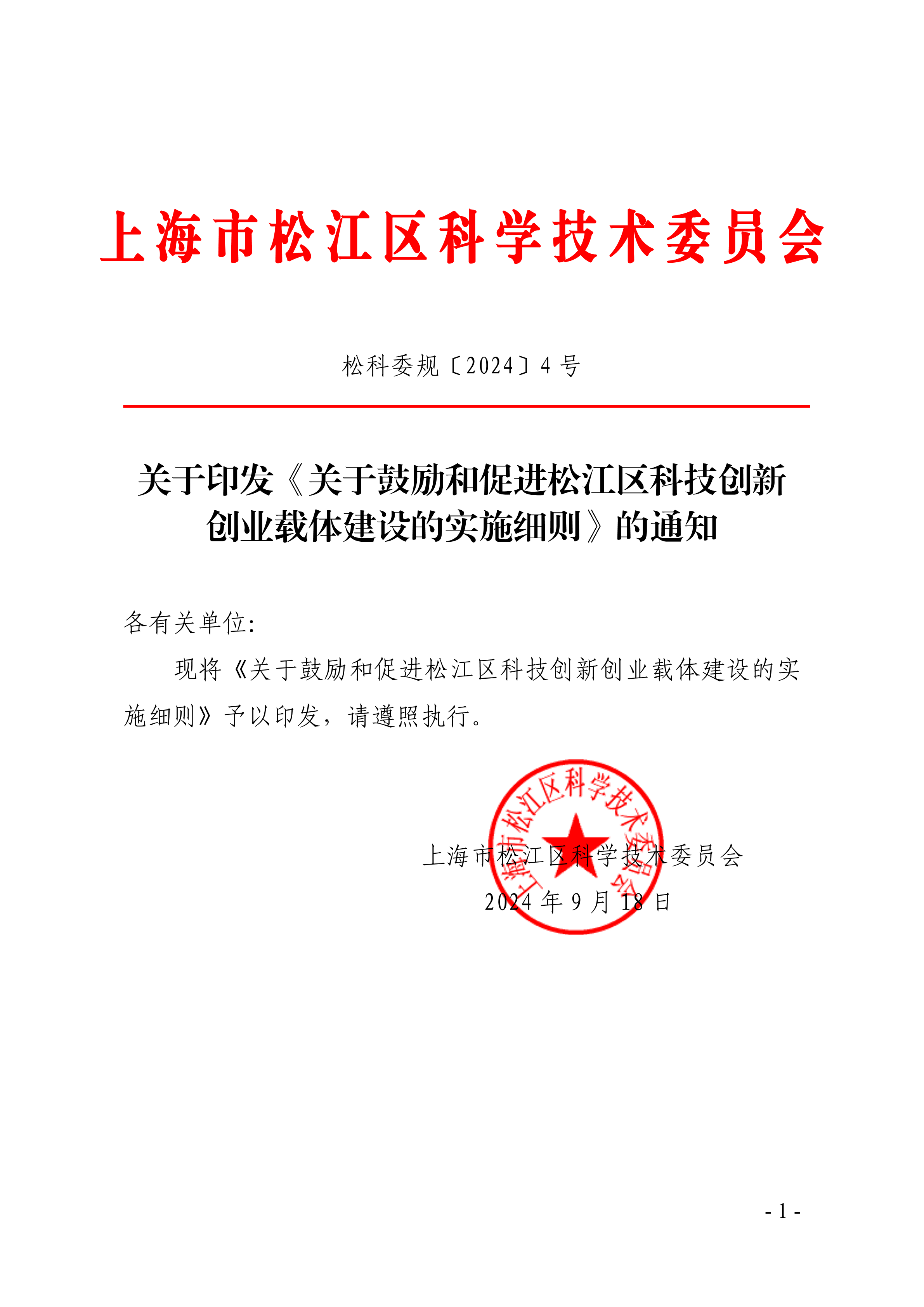 关于印发《关于鼓励和促进松江区科技创新创业载体建设的实施细则》的通知