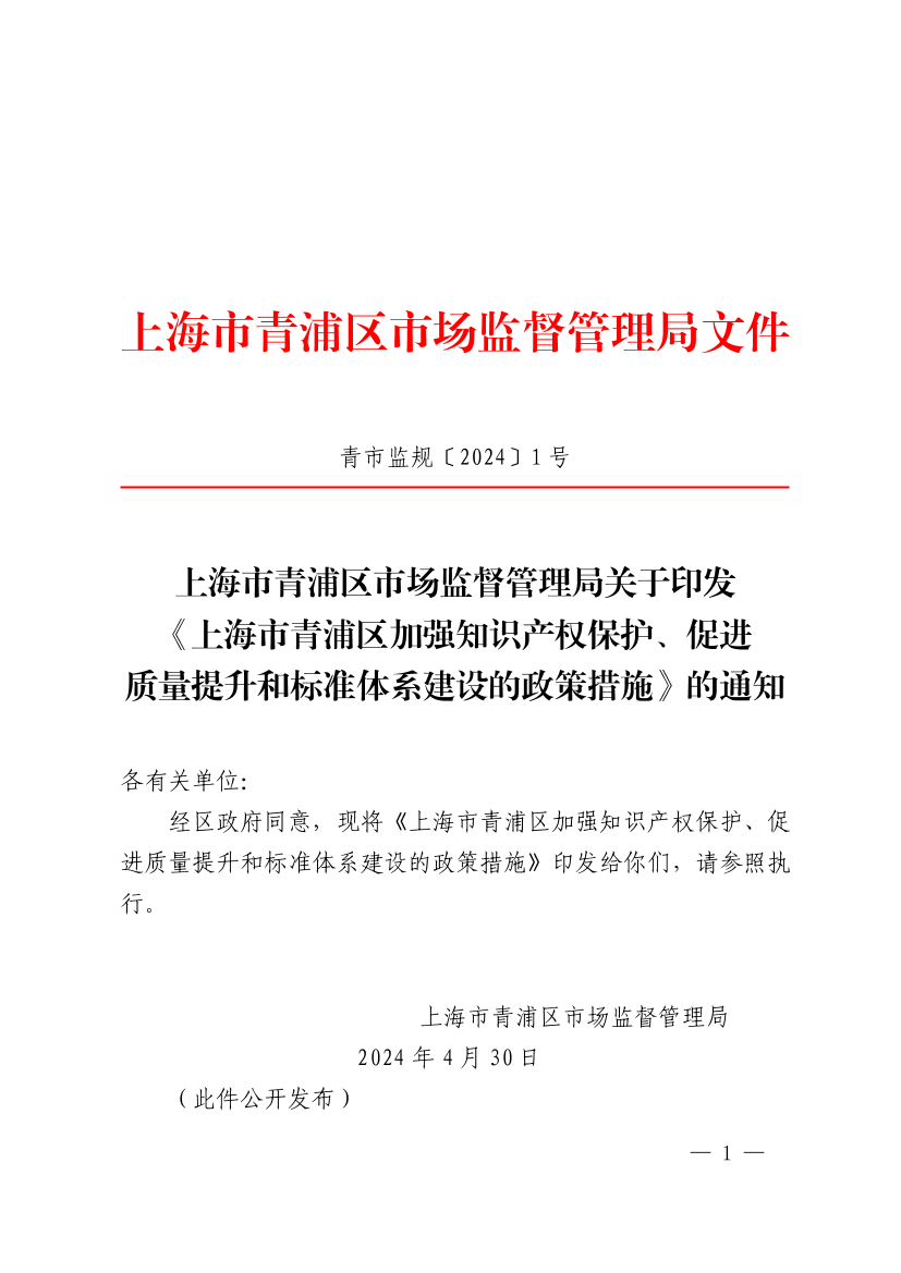 上海市青浦区加强知识产权保护、促进质量提升和标准体系建设的政策措施