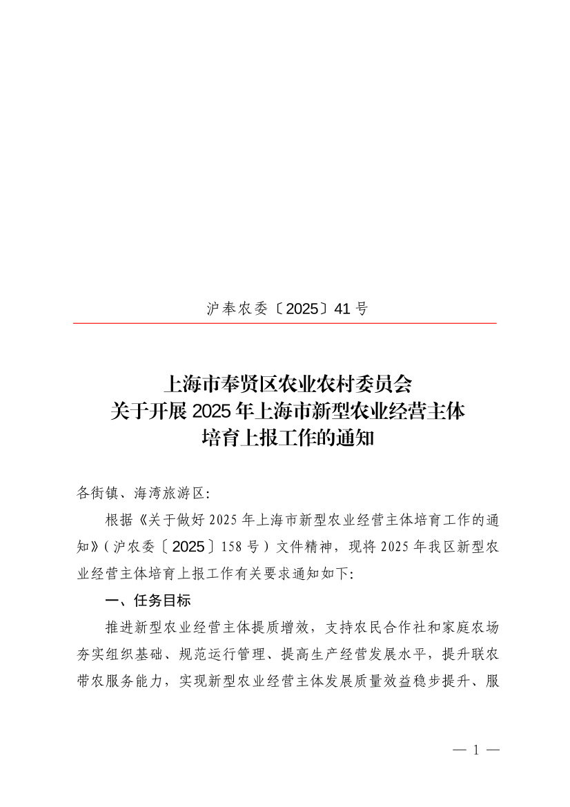 根据《关于做好2025年上海市新型农业经营主体培育工作的通知》(沪农委〔2025〕158号)文件精神,现将2025年我区新型农业经营主体培育上报工作有关要求通知如下: