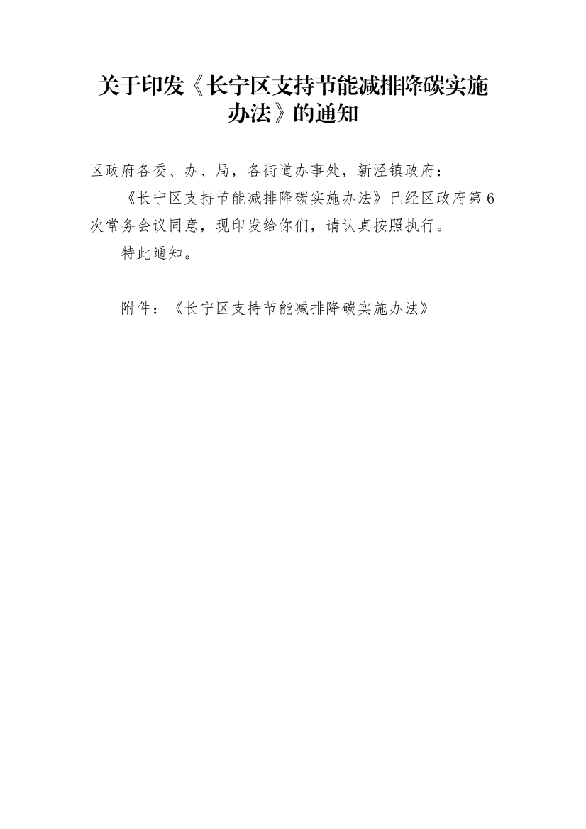 《长宁区支持节能减排降碳实施办法》已经区政府第6次常务会议同意,现印发给你们,请认真按照执行。